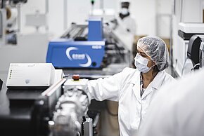 PAV stellt am Standort Lütjensee in Schleswig-Holstein jede Woche OP-Masken des Typ IIR in hohen Stückzahlen her. Zu unseren Kund:innen zählen neben der öffentlichen Hand vor allem Unternehmen, die aufgrund der aktuellen Situation einen erhöhten Bedarf an medizinischer Schutzausrüstung haben und Ärzte. Um nachhaltig wettbewerbsfähig mit Herstellern aus Fernost zu sein, setzen wir auf besonders leistungsstarke Maschinen und Komponenten aus Deutschland. Diese ermöglichen die Produktion von etwa 700 OP-Masken pro Minute.