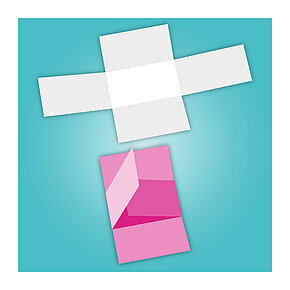 Beim Kreuzfolder kommt neben dem Falzen auch noch das Stanzen zum Einsatz. Um die Grundfläche herum gruppieren sich vier Außenteile in Kreuzform, die übereinander zu einem handlichen Viereck zusammengeklappt werden. In welcher Reihenfolge der Kreuzfolder aufgefaltet werden soll, können Sie individuell vorgeben. Wieder ausgebreitet liegt im Handumdrehen ein Mailing mit zehn Seiten vor. Kreuzfolder werden gern genutzt, um Produkt- oder Programminformationen aufmerksamkeitsstark zu transportieren – Stichwort „Storytelling“.